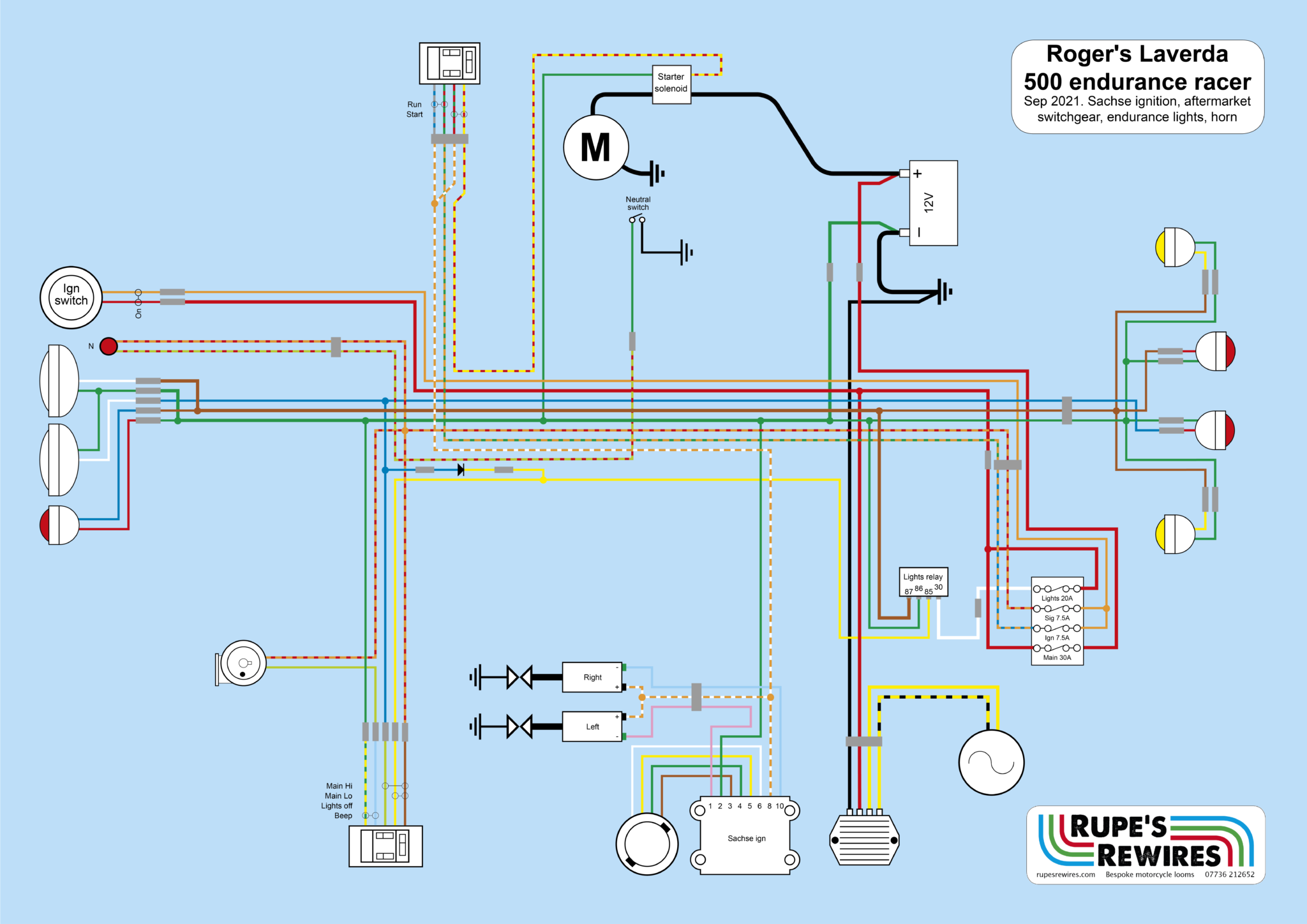 Endurance bikes back then had cobbled-on headlights, one set up for braking, the other for high speed. Lap scorers had to figure out which their bike was in a sea of headlights so Laverda put a red ID light on the left of the fairing, and also added two lights that shone onto the rear spindle for night time wheel changes. Roger fancied one light front and back for low beam, and both for high beam. I measured the current drain of all these bulbs and decided to run some of them through a relay to spare the left handlebar switch.