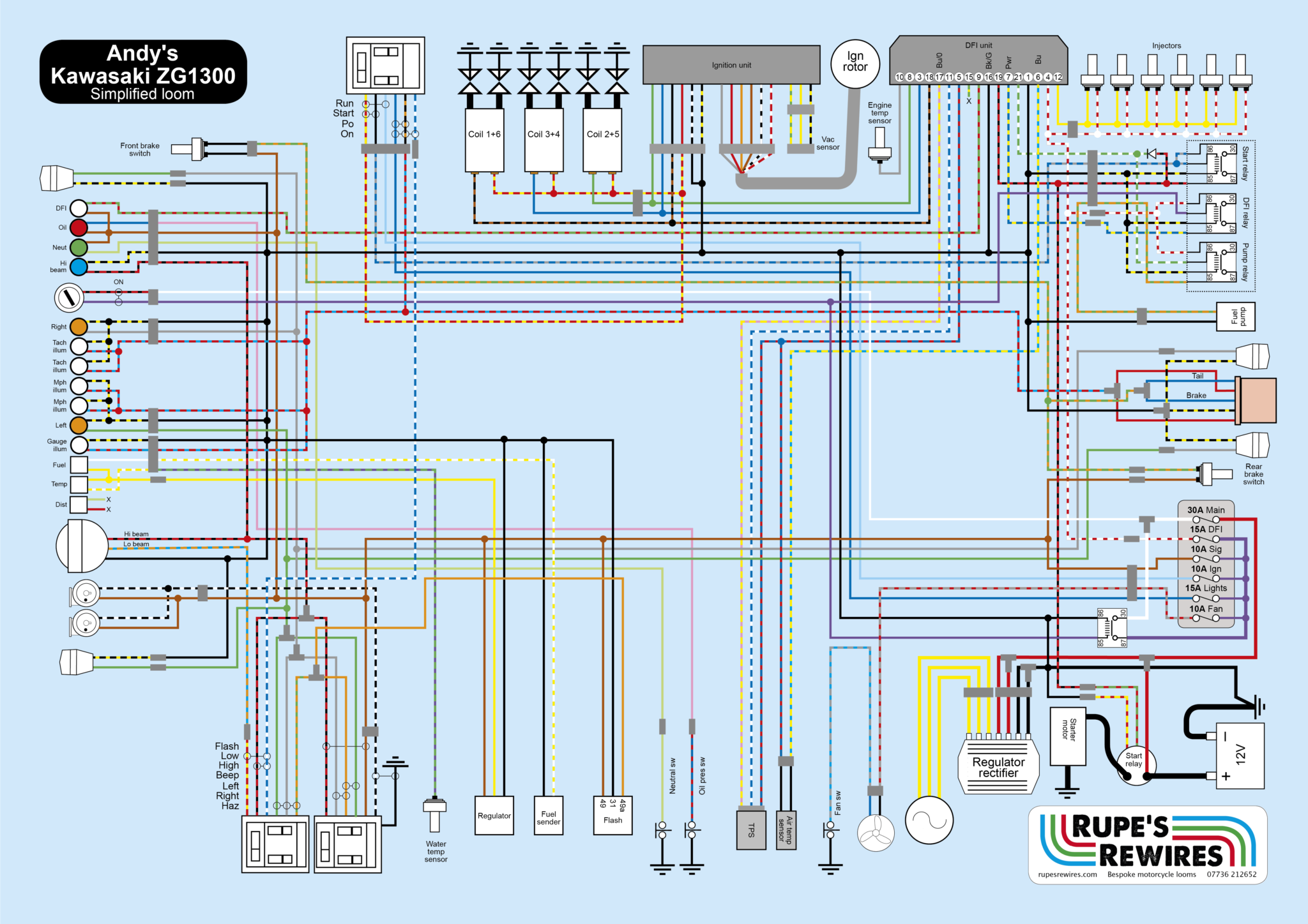 The wiring diagram doesn’t look too bad, but that’s because (with Andy’s encouragement) I’ve dramatically simplified it over the original. The standard loom had everything here plus the delights of self cancelling indicators, even more relays, a massively complex parking/security arrangement, and warning systems for bulb failure and low oil level. But none of that really matters. The brain ache comes from the fact that on this huge motorbike there is so little room for the wiring.