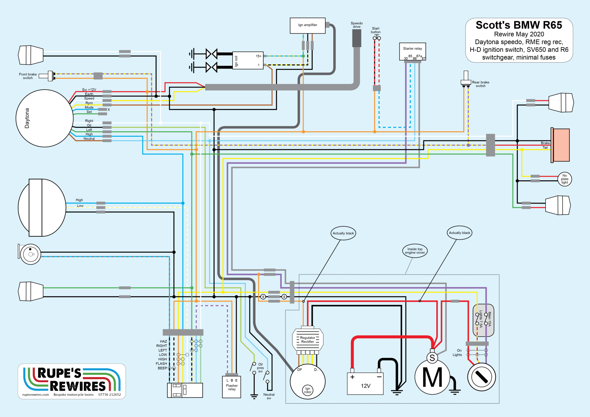 After much discussion Scott decided to fit the battery, fuse box and ignition switch inside the top engine casing. He also replaced the separate rectifier and regulator for a fabulously expensive regulator rectifier unit. I’ve done loads of these boxers but this was the first time all these components were hidden away in the same place. The result is almost no wires coming out of the engine: just the ignition trigger wires, plus a main earth, a lighting wire, a main feed wire and the solenoid wire. Neat, huh? Especially when you think of all the gubbins that trails for yards in every direction on the standard loom. If you’re building a cafe racer boxer, I’d say this is the wiring diagram to use.