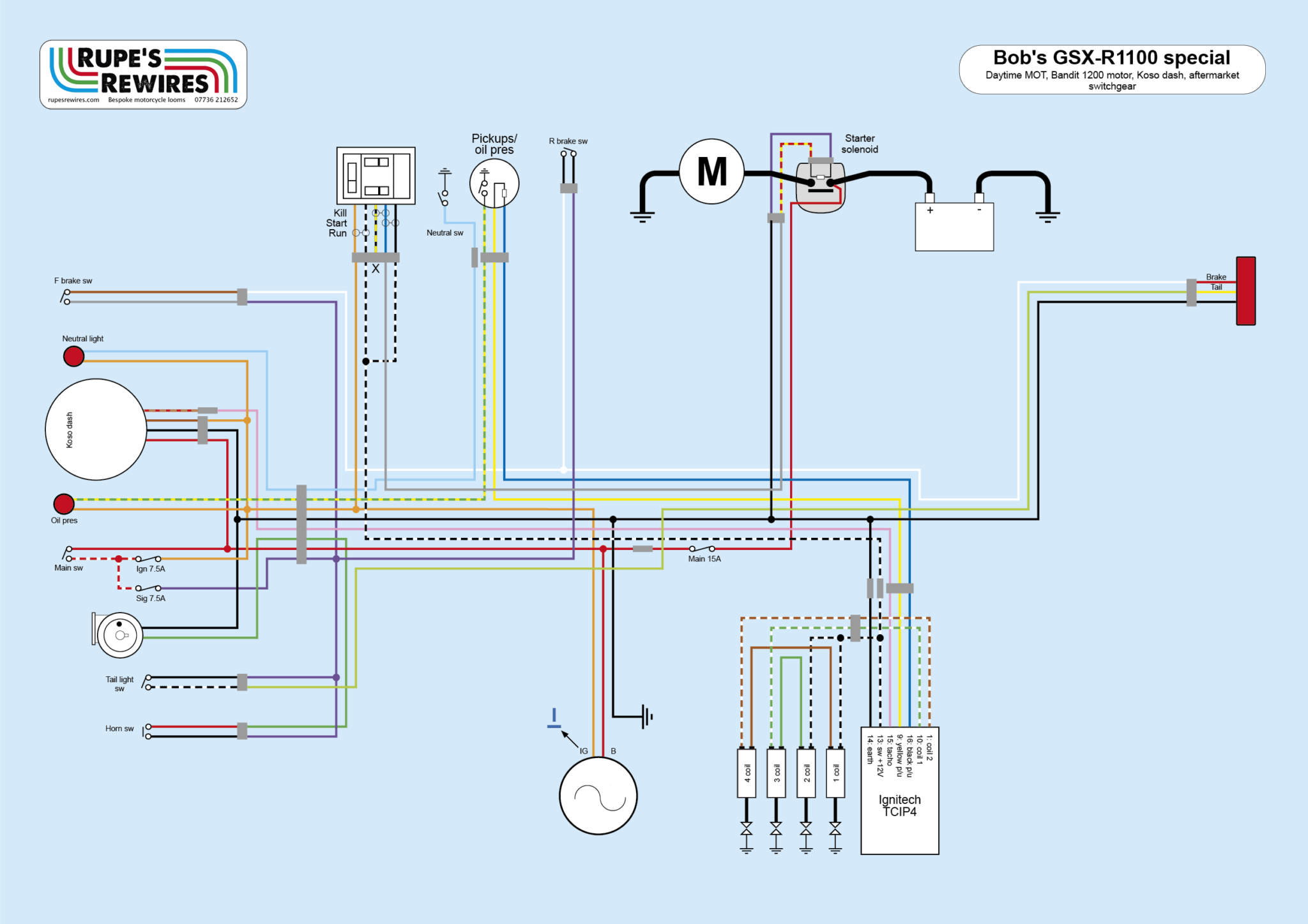 Bob bought the bike as a GSX-R750 racer. The existing wiring loom worked fine, but it was a pure race thing which wouldn’t be ideal on the road. He intends to ride the bike (now fitted with a Bandit 1200 motor) on the road on sunny days, as well as on track. So it needed a fuse or two, a tail and brake light, and a horn.