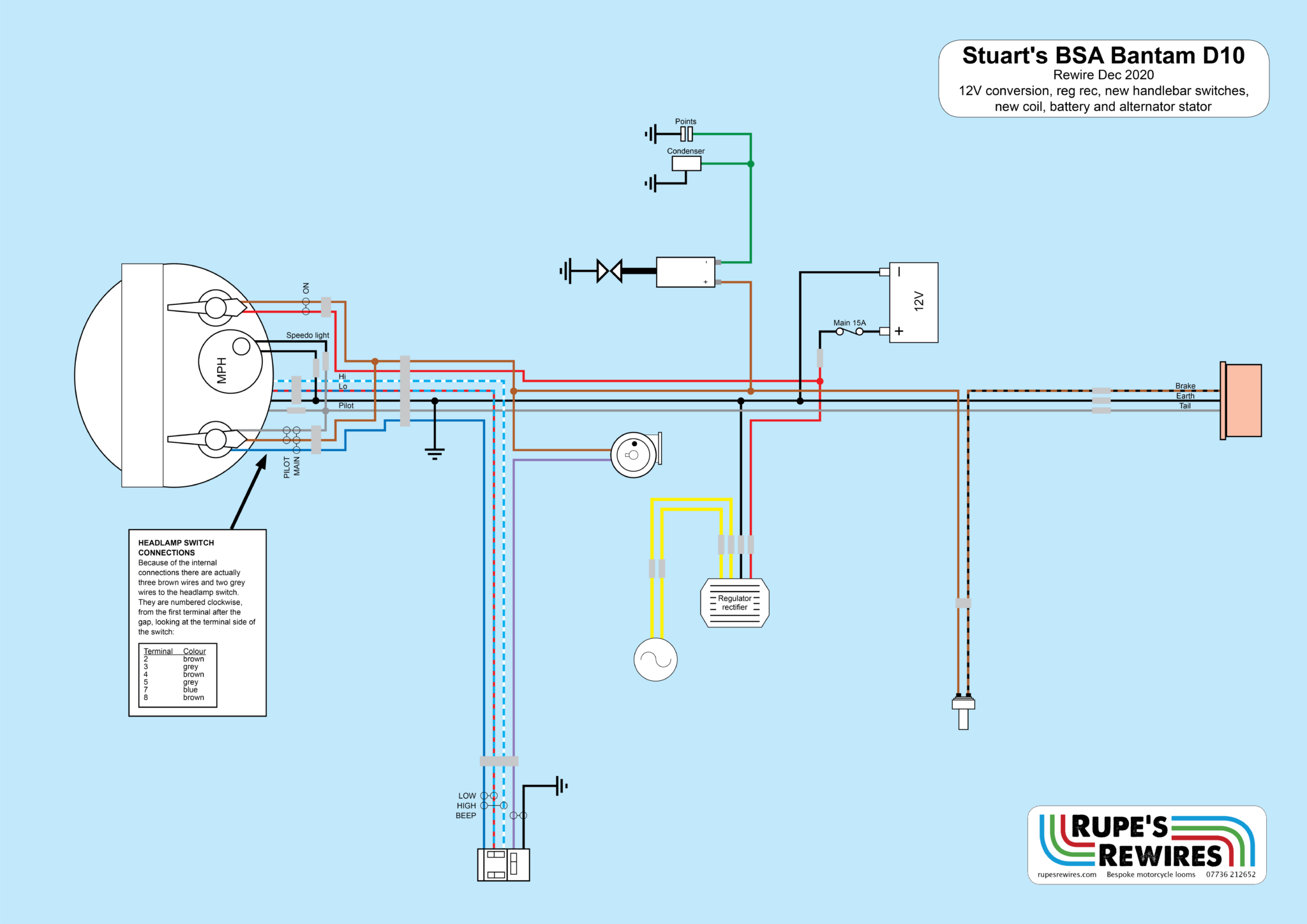 If you use the parts above, the wiring diagram here will work for any Bantam or any other small Brit with biscuit tin switchgear, original ignition and no indicators.