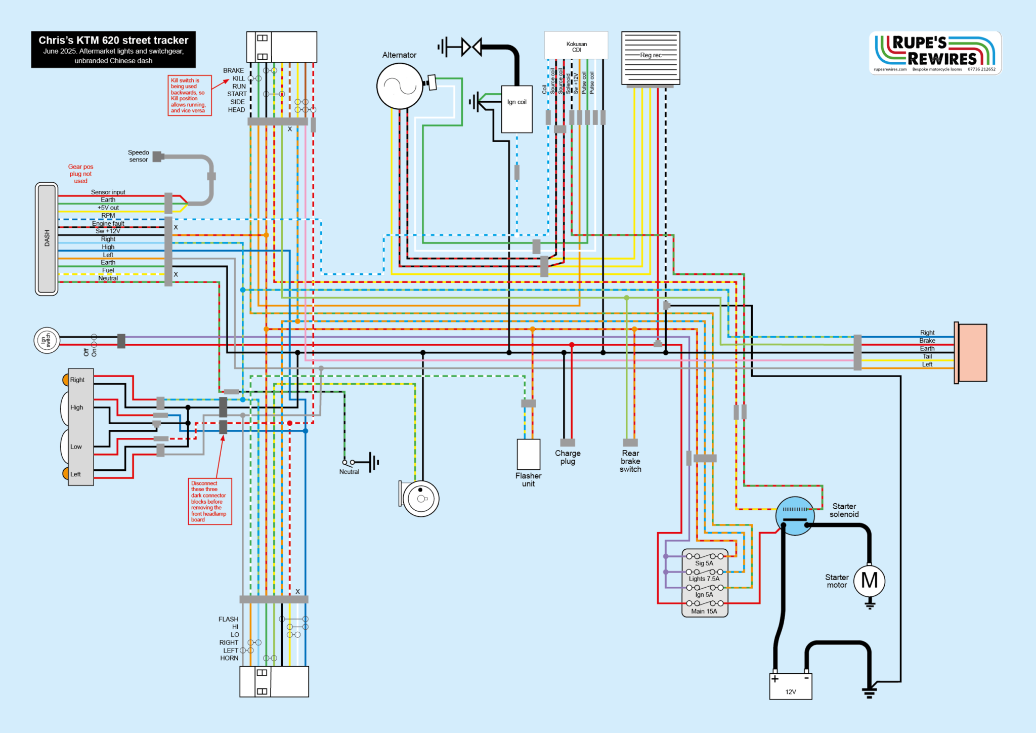 This meant I could build nearly all the loom using thin cable – actually 11 amp, which is still masses for the kind of loads LEDs generate, but you can’t get lighter cable in a good range of colours. Thin cable means the overall loom bulk is less, so it gets easier to route around the bike.