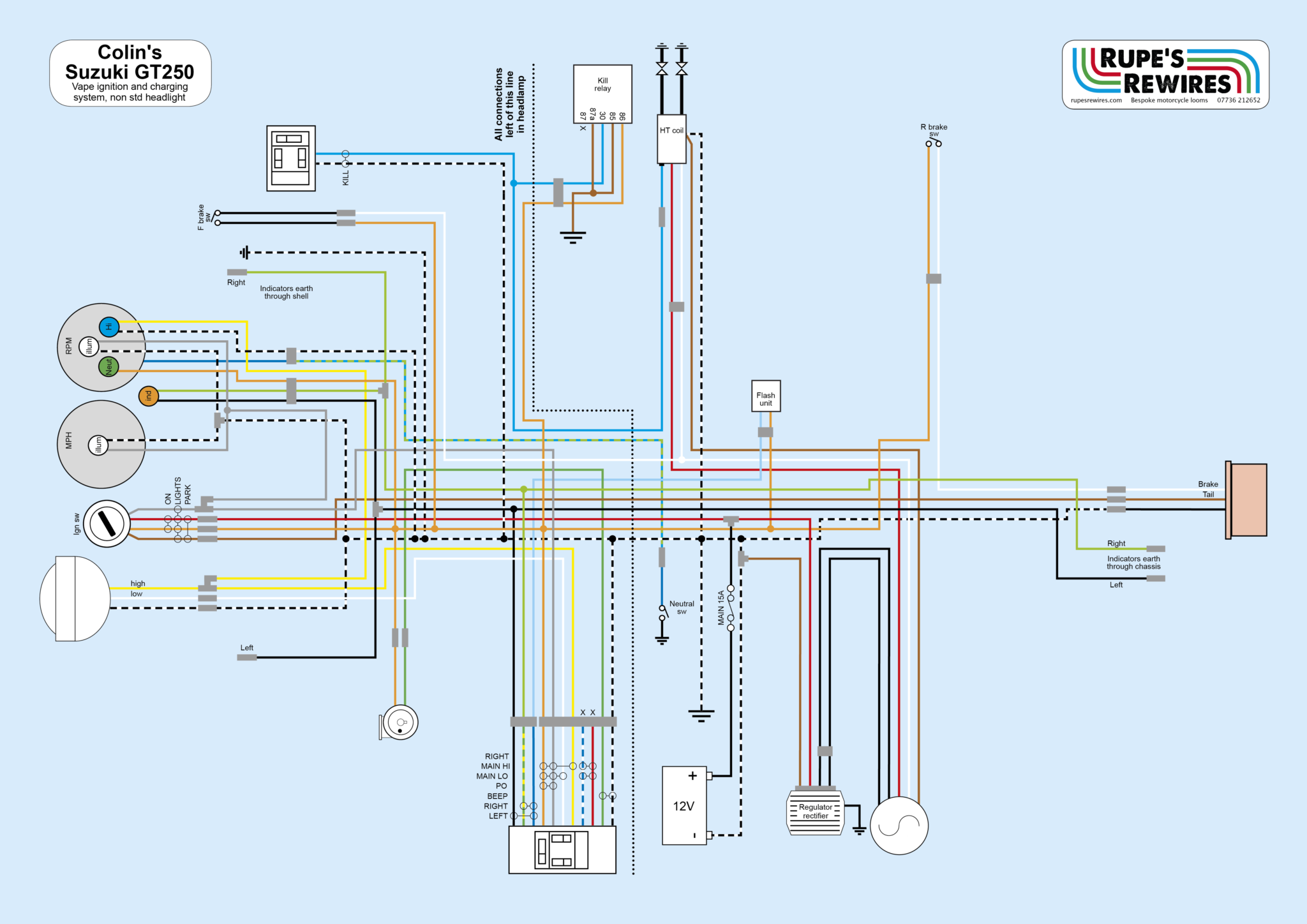I used Suzuki colours for the wires, but also Vape colours for the ignition and charging. You can see on the diagram how the Vape system simplifies the wiring. The left handlebar switch doesn’t need two wires any more. These were used to switch in extra coils for lights.