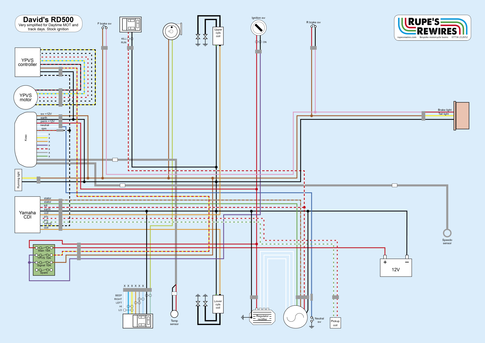 As David already has one RD500 he just wants this one for track days and sunny days, so the loom was effectively an ignition/charging setup plus running lights. This was helpful, because there’s a lot of heat buildup around a V4, especially when it’s boxed into a deep frame. So it was reasonably easy to keep the skinny loom away from hot exhaust pipes.