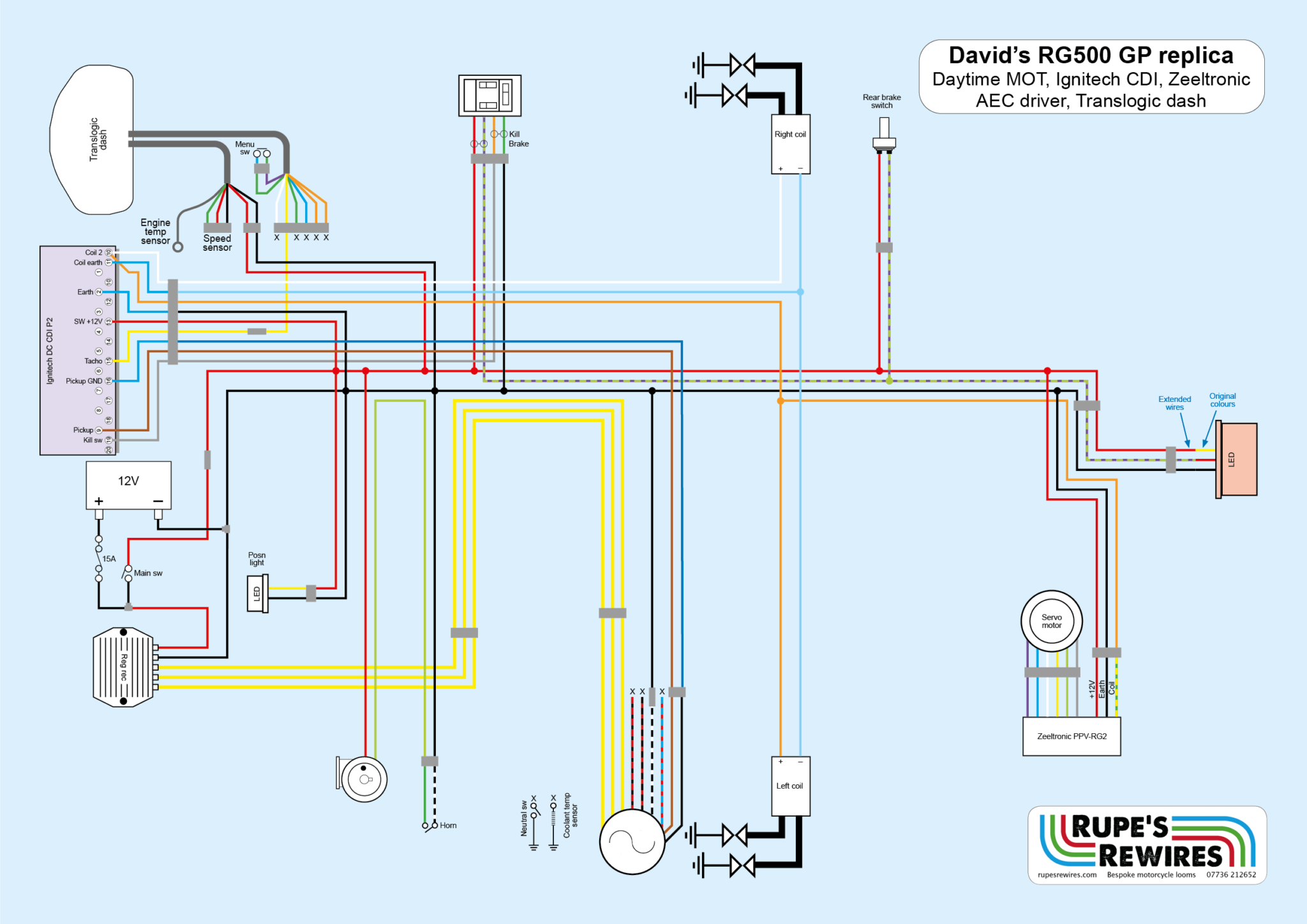 It’s just a daytime MOT spec, but the loom was quite tricky to design and build. Two stroke fours get very hot so above all you have to keep the wires and sleeves away from the noisy thing in the middle. I also got a bit baffled by the Ignitech CDI ignition, which has two coil outputs. Ignitech’s online RG500 instructions say you should use both, but Mark Dent had only used one. I asked Jiri at Ignitech, who said running all four cylinders on one output is correct.