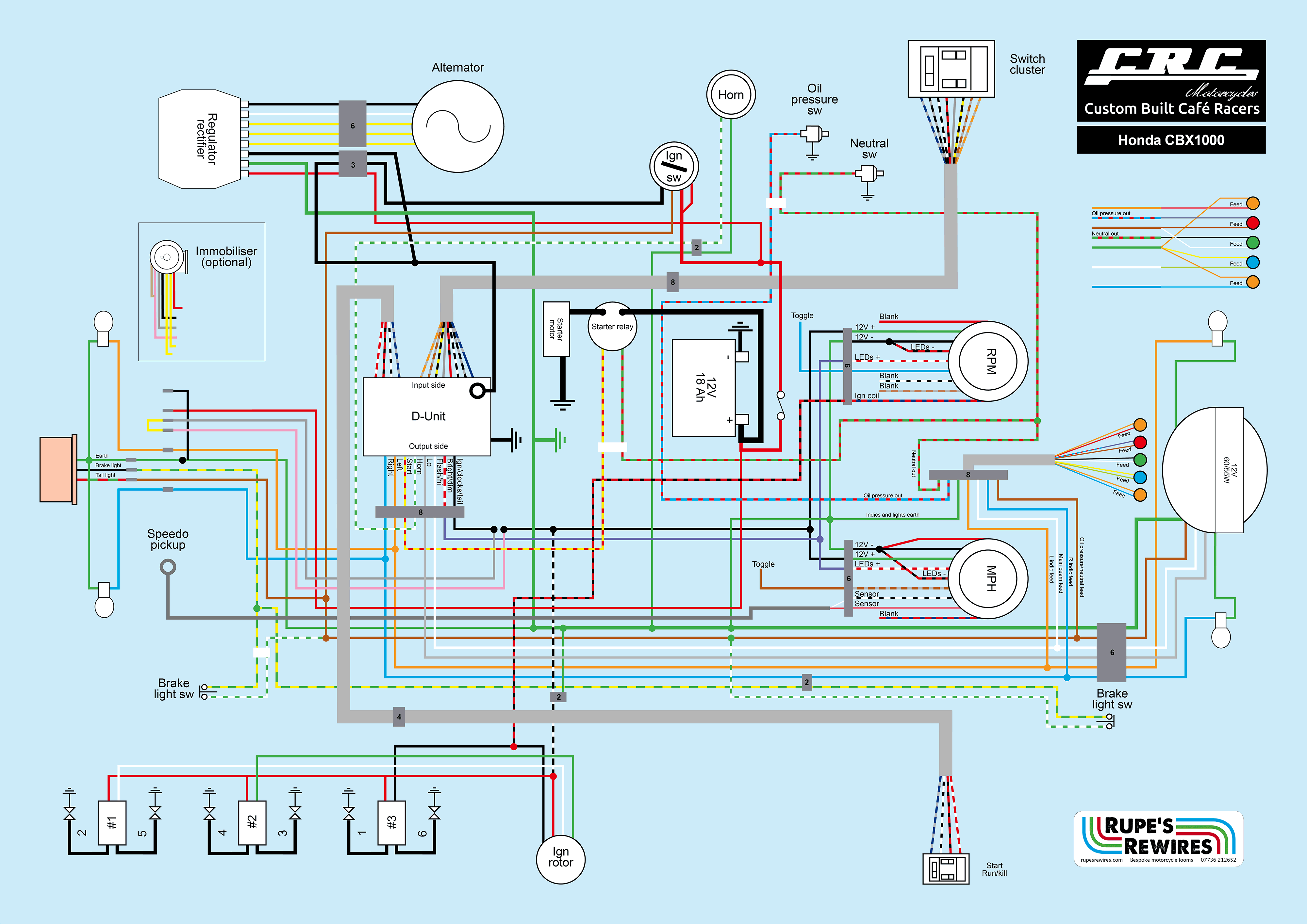 This is, without doubt, the craziest thing I’ve done. It’s a unique bike designed and built by CRC Motorcycles in Wembley. They commissioned a complete motorcycle wiring loom design and build, including wiring diagram. As with any one-off, the spec changed a few times so the cable colours could be simpler (see the CRC Magnum). All-new components include Dyna ignition, Smiths clocks, Motogadget warning lights, Deutsch connectors and an optional immobiliser.