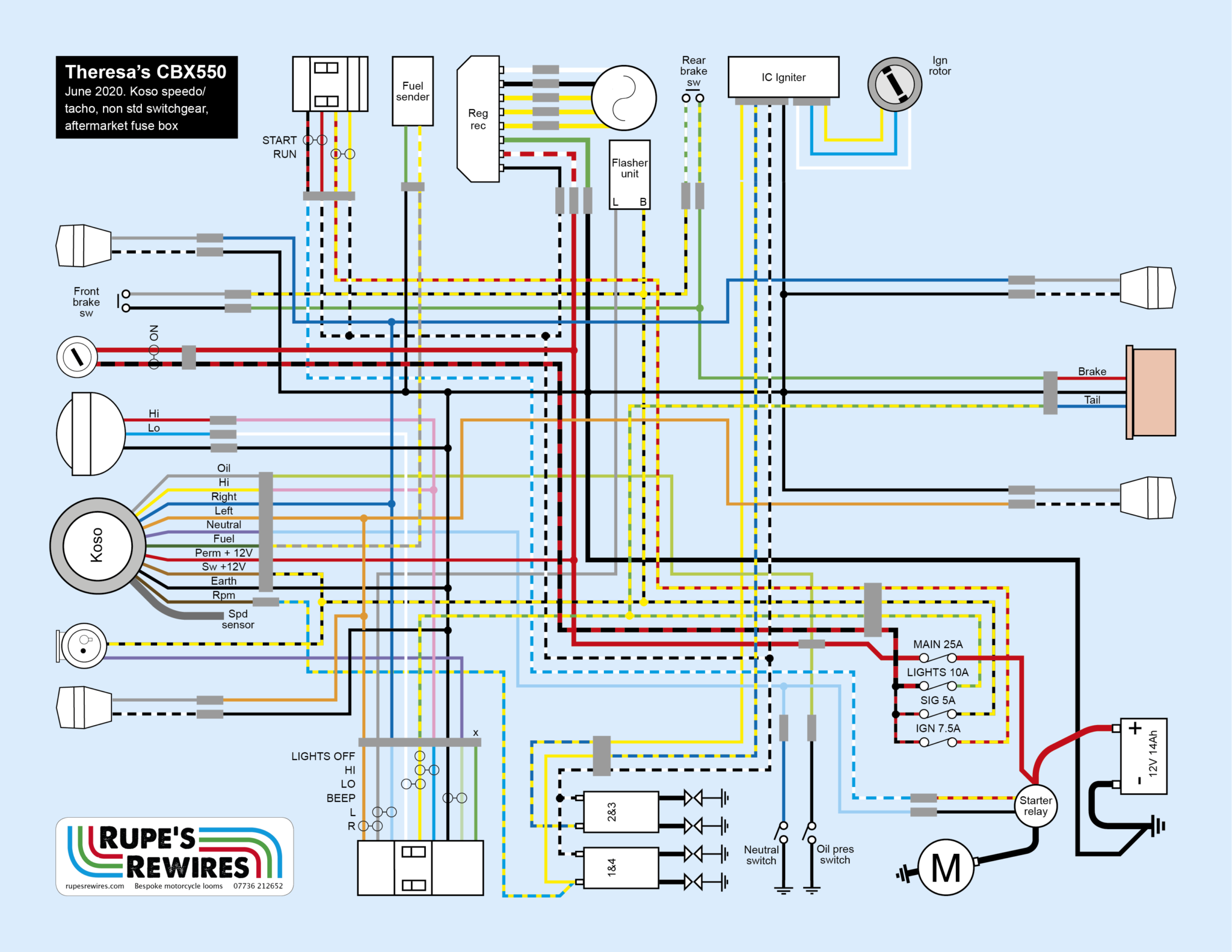 It’s what you would call a sensible special: easily visible indicators, a big headlight, a near-standard exhaust and a reasonable riding position. Tail light is LED, the Honda clocks have been replaced by a Koso speedo/tacho, and ignition and charging has been left as original. They’d also chosen a Domino throttle, which works nicely but uses up valuable handlebar space, and so obliged them to find narrow switch clusters. They couldn’t find any high quality ones, and nor could I, so they settled for universal unbranded items.