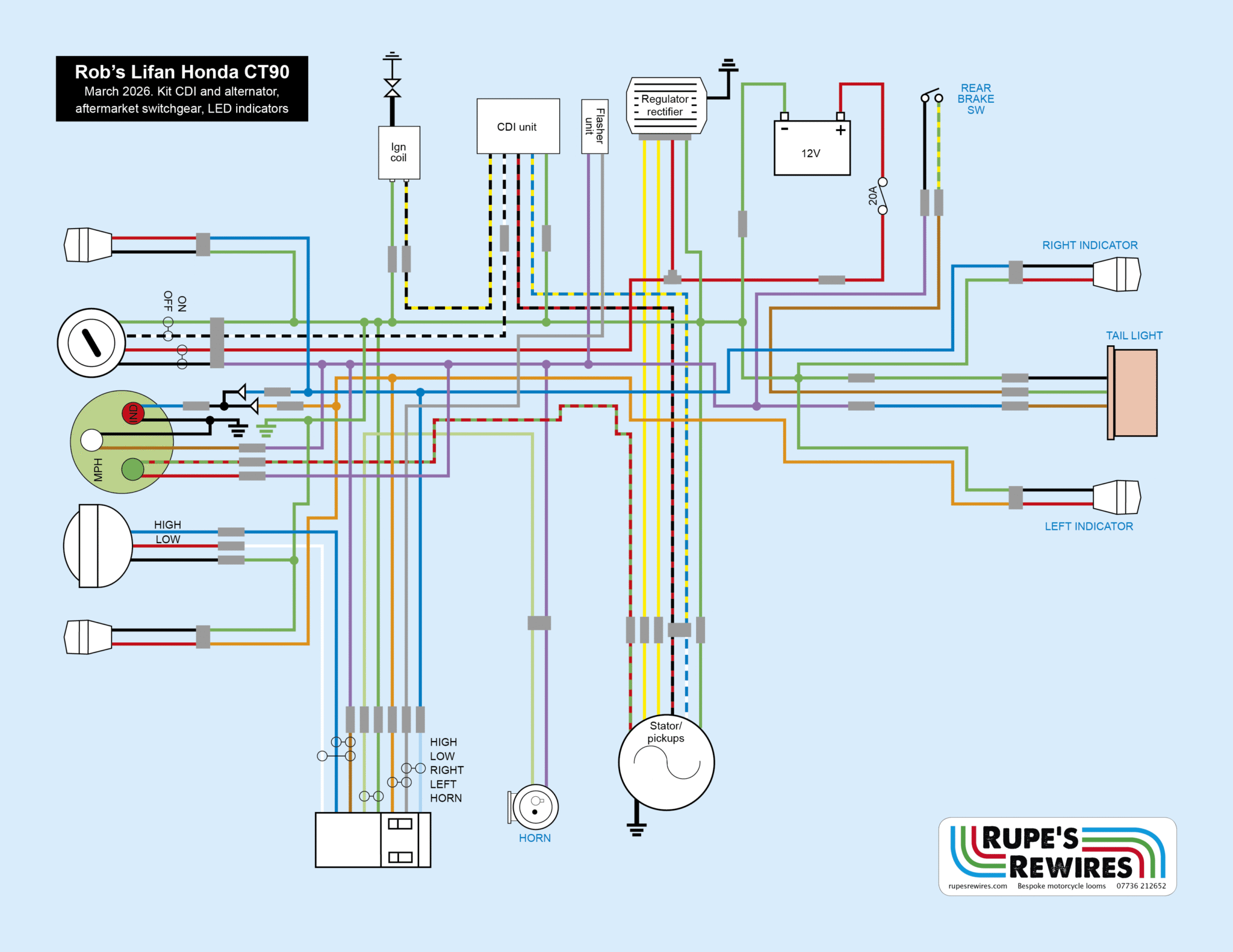 The original speedo had two warning lights: neutral and oil. The Lifan doesn’t have an oil light, so I made a tweaker diode pack to convert the oil light into an indicator warning light instead.