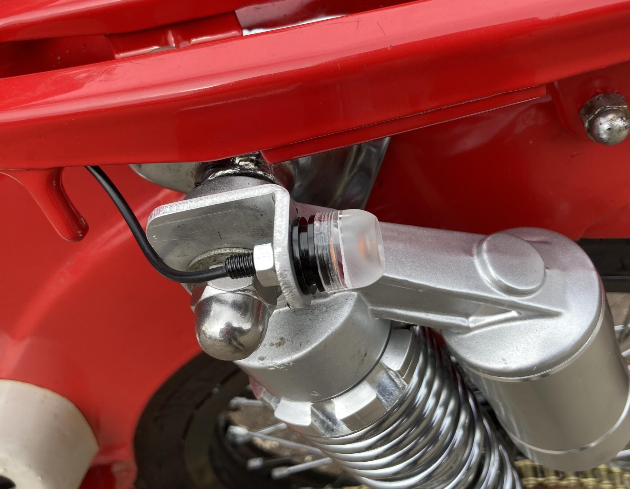 Emboldened by success, I realised the LED indicators would fit on the handlebars with P clips, and on the shocks with little folded brackets. That just left the ignition switch, which had been fitted to the somewhat abused air filter cover. I made a fitting to neaten it up. There was no need for an air filter with the new engine because it came with a carb and foam filter.