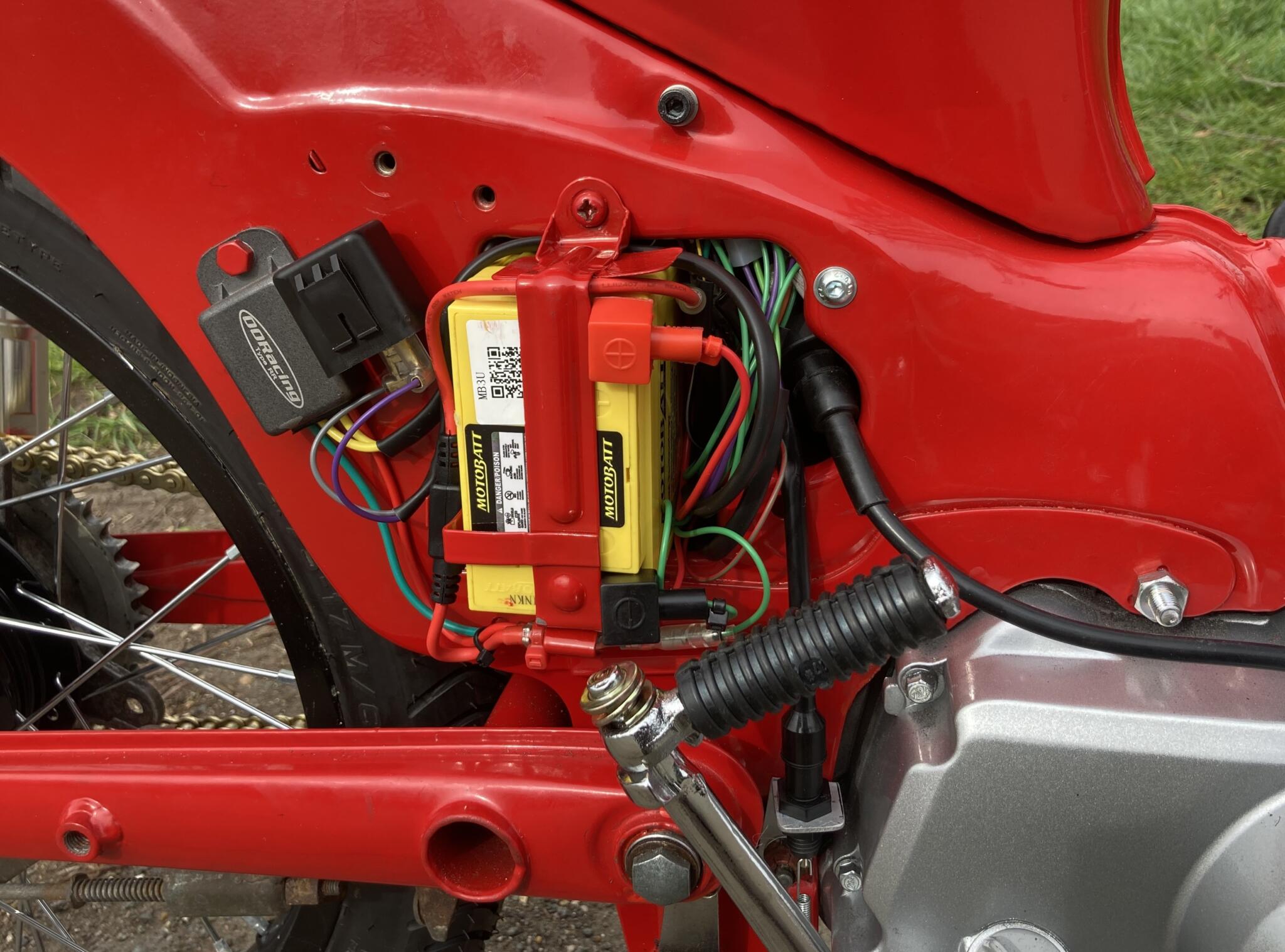 This was the tricky bit. The modern ignition and charging needs more wires than Honda made space for. The modern battery is bigger too. But it all squeezes in
