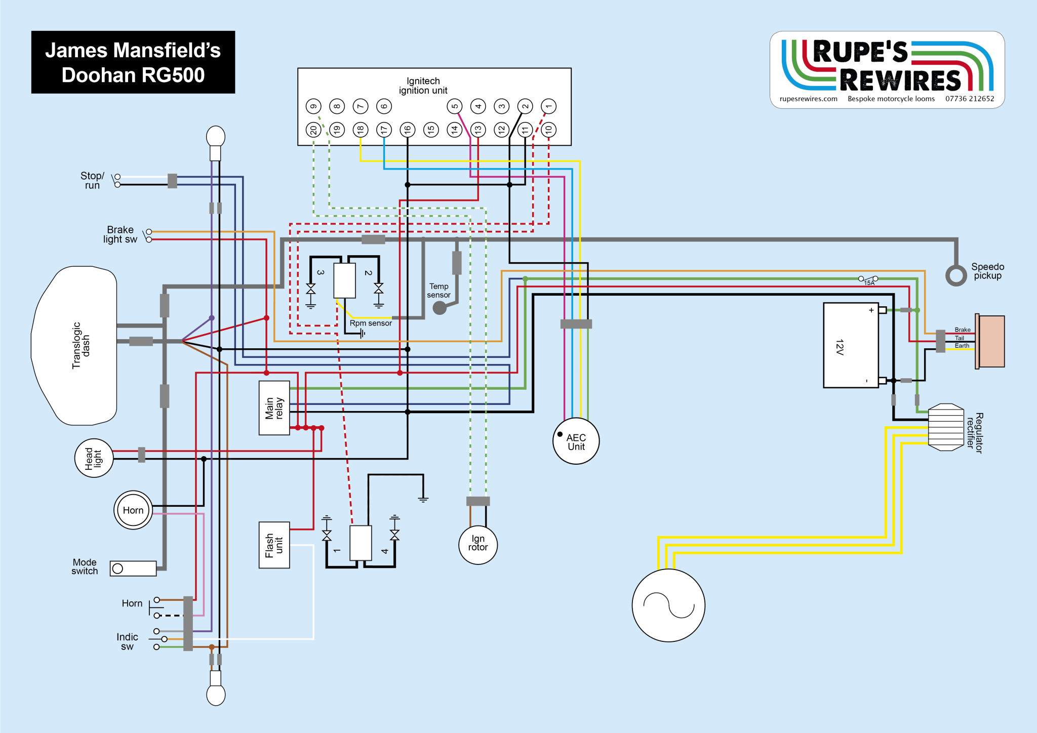I designed and built the loom when the bike was half finished. The frame was mostly complete, and Barry had already provided all the mounting points needed. Swing arm is Yamaha R6, suspension is Öhlins and wheels are carbon BST. The bodywork is carbon, made by Russel Lowe at Bike Styles UK. He rescued an original NSR set from a skip at the German GP. Tank is hand-beaten and wheeled by Neil Martin of CC Engineering in Hull.