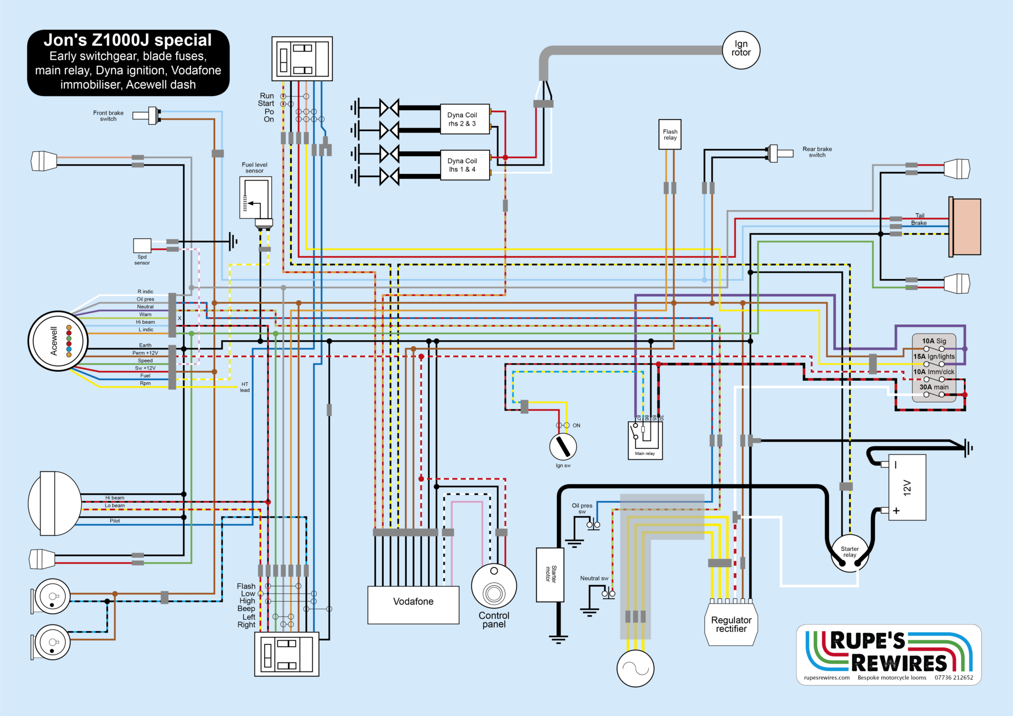 The bodywork was away being painted metalflake blue, so it seemed a good time to sort the electrics out. As with his Eddie Lawson Z1100, Jon wanted an immobiliser. You can see it on the wiring diagram, but I’ve disguised the wire colours and identifiers (obvs). Only Jon has a diagram that actually shows what’s what. It operates as an extra security feature: turn on the ignition, briefly touch the thingy on the controller, and away you go. No touchy, no engine.