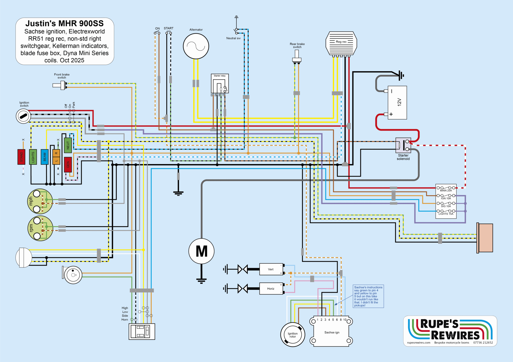 I went round to Rupe’s as he was starting the job and found him not entirely happy. Long story short, the loom was for a much earlier 900SS model, with a simpler dash, simpler switchgear and no electric start. (The 1983-onwards MHRs, we learned, all had electric starts. Ducati only made 1400 of them.)