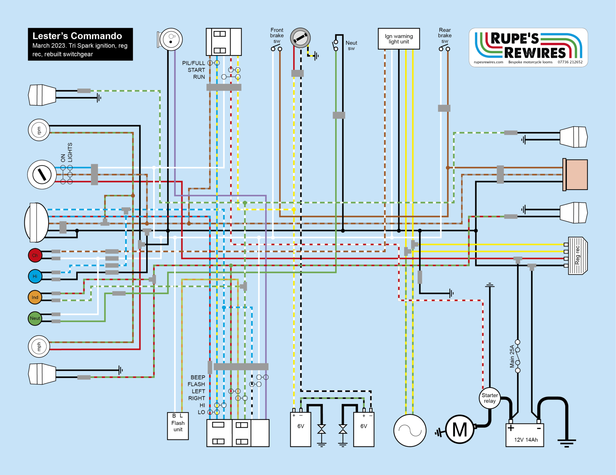 On the diagram I have kept as many wire colours as possible the same. The big difference is that earth is now black, rather than red. The Tri-Spark needs two 6V coils in series, rather than the 12V ones actually on the bike, but Lester will sort that out later. There’s also a temporary headlight ‘on’ switch. There was a brass contact missing in one of the switches, so until another one turns up at the right money his ‘on’ switch is between the coils.
