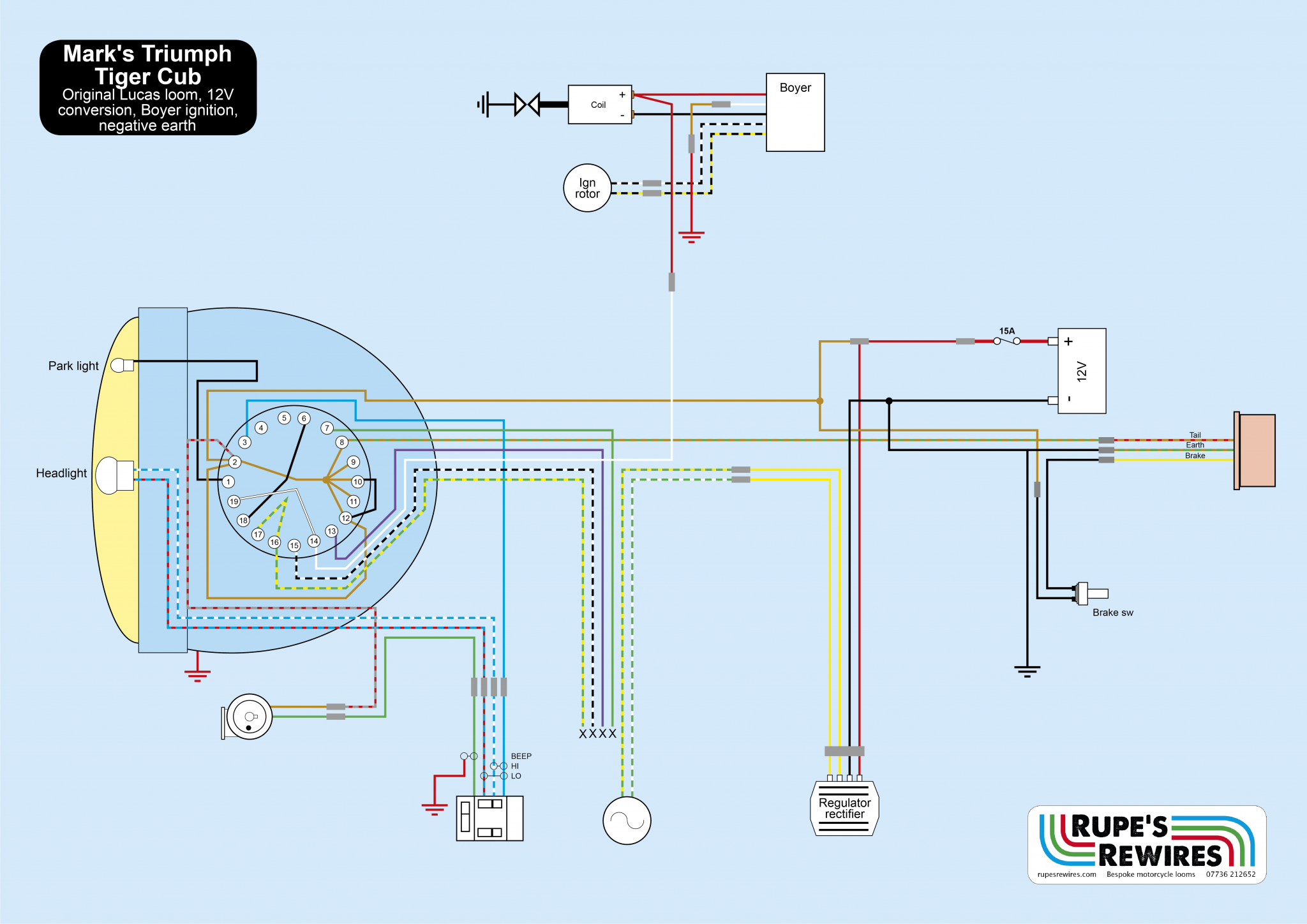 I think Mark was right to be confused. The Lucas pattern harness he’d bought was for an original Tiger Cub, with 6 volts, distributor ignition and switched charging coils. Being a sensible sort of chap, Mark had abolished all three of these anachronisms. Instead he had gone for 12 volt electrics, a regulator rectifier and Boyer electronic ignition. And that’s why the loom was confusing.