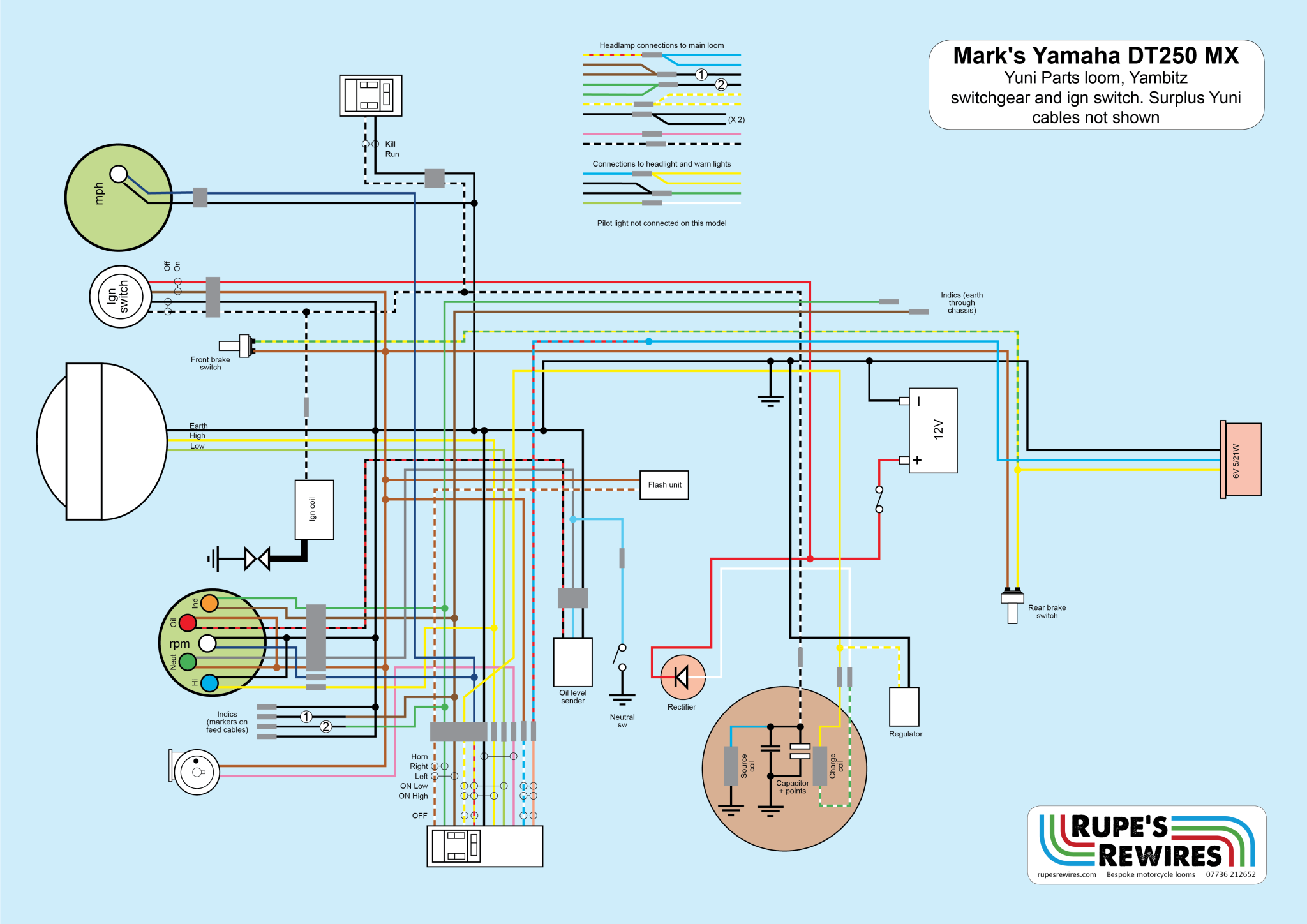 Mark had already bought pattern switchgear and a pattern ignition switch from the very handy Yambits. Then I noticed that you can get pattern looms for DT250s on eBay. They are made in the far east, and fitting one seemed a good way to keep the cost down. The price was £44, which in the UK doesn’t even cover the materials. So it seemed a good bet.