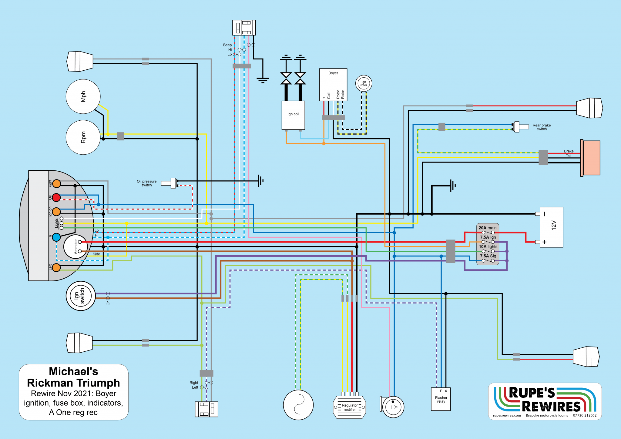 I drew a colour wiring diagram, and Michael got stuck in. He added a few upgrades – a ‘system on’ warning light, repeaters for the indicators he wanted to fit, and a regulator rectifier rather than the old-school bridge rectifier and Zener the bike was running.