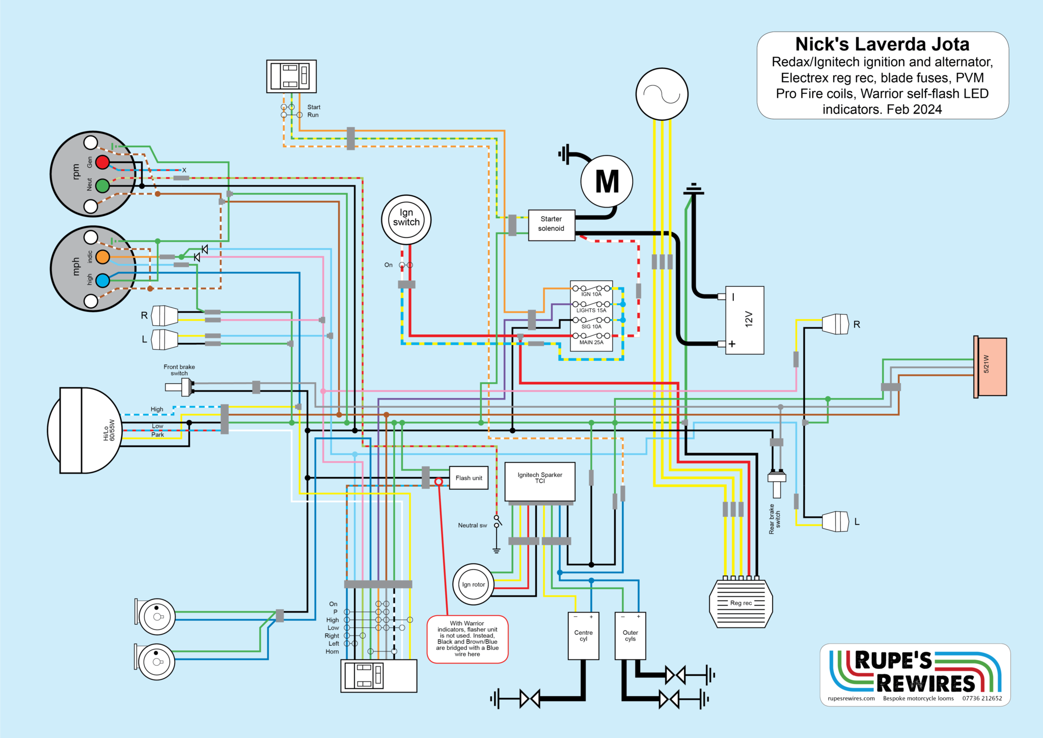 Hello to another highly-prized Jota. This one had stopped charging and started blowing its main fuse, so owner Nick was keen to banish all possible sources of evil. Along with the bike he brought along new indicators, a new alternator and stator, a Redax ignition kit (sold by Keith Nairn at Laverda Scozia), a new battery and reg rec, and a handful of handlebar switches.