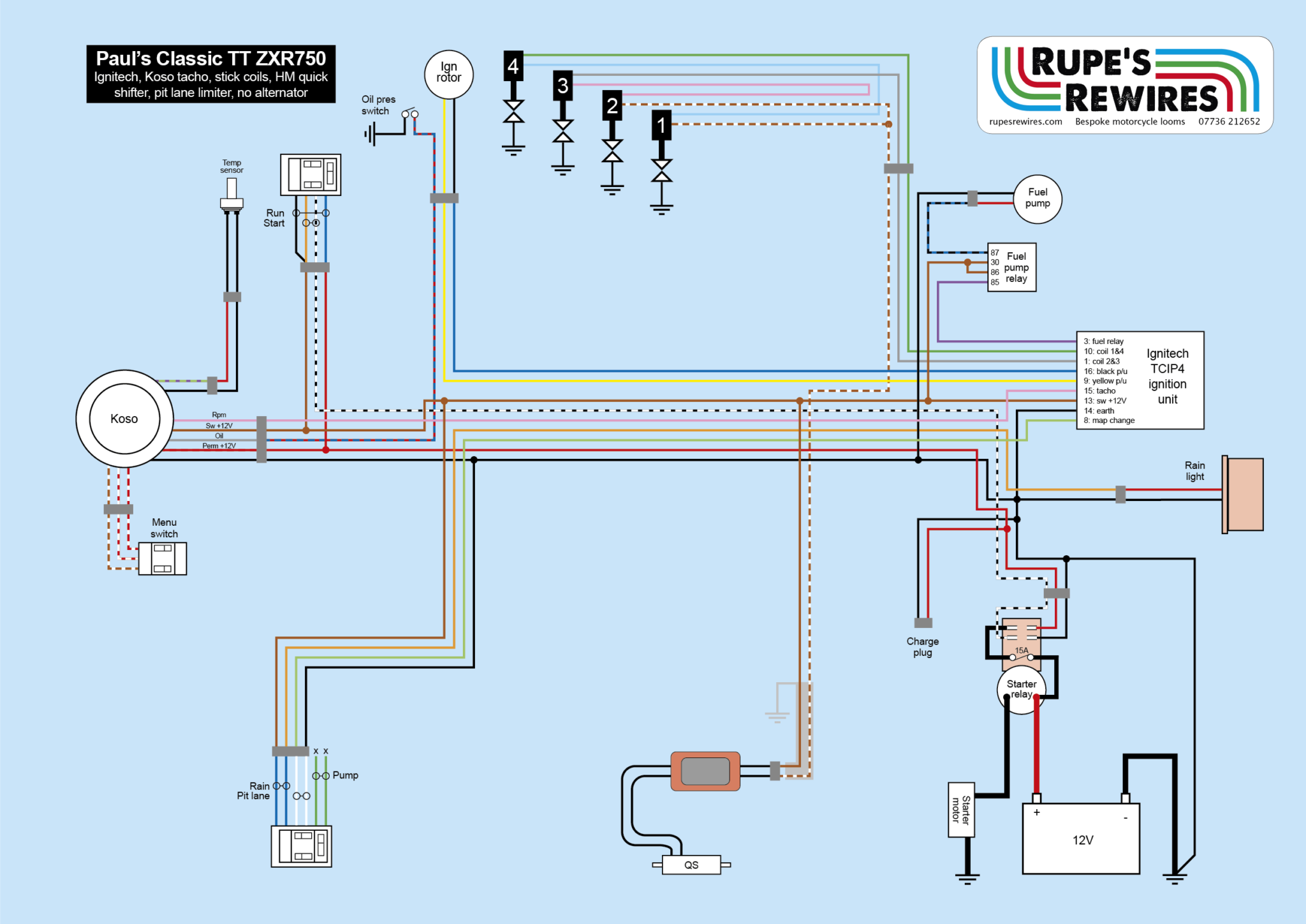 Apologies for the half arsed pics – I forgot to take decent ones. Paul has raced the bike at the Classic TT, which is about as serious as it gets. So he wanted an electrical system that was going to work reliably. He’d fitted stick coils as they are rumored to give a small power increase. And because it’s a lovely machine it needed a neat and tidy wiring job in any case.