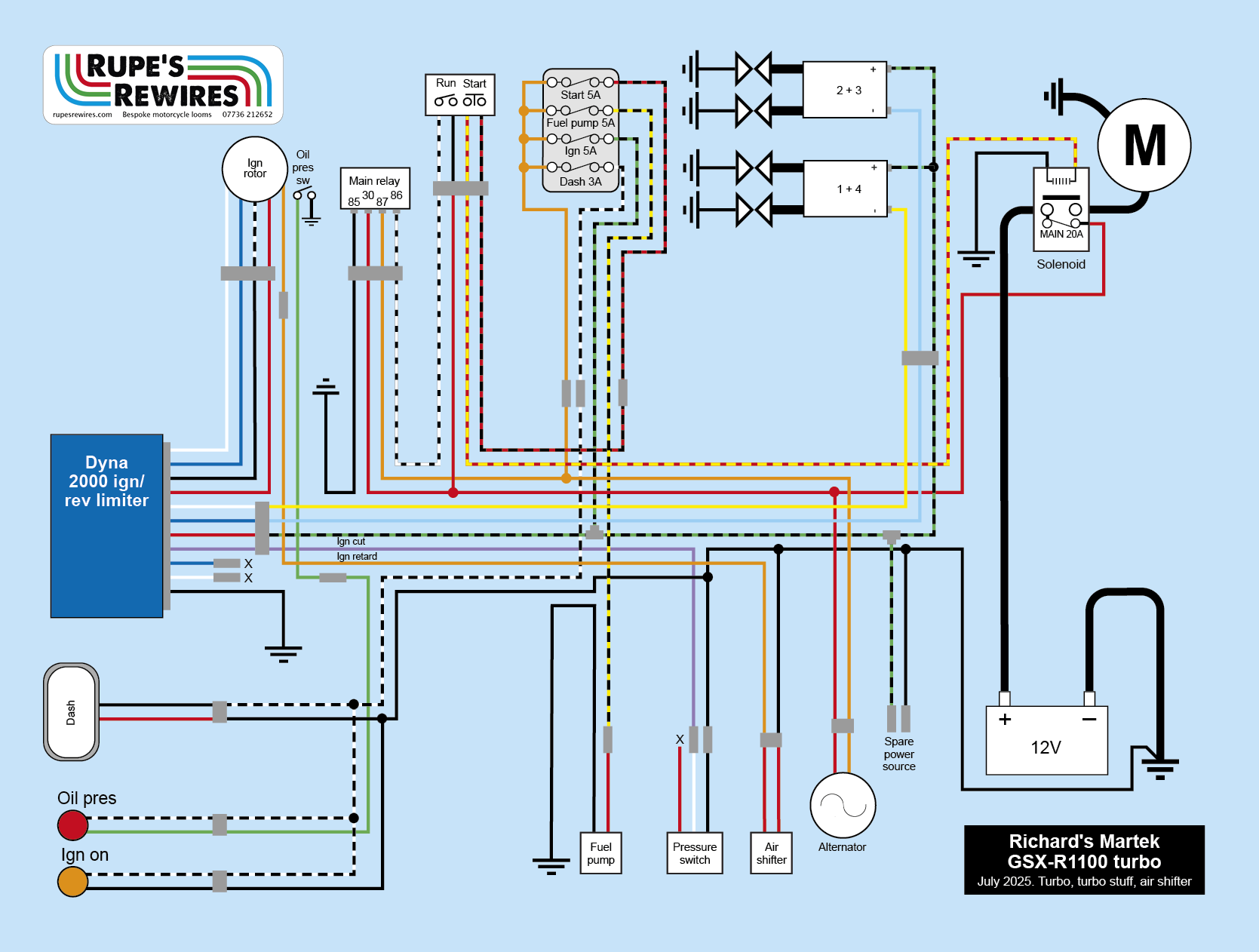 The whole bike runs via the kill switch, but to be sure I used it to work a relay, and thus avoid loading the switch with too much current. The bike has a pressure switch, which can send an input to the ignition box at a given level of boost. The idea is to use the input to retard the ignition, although Ruichard says he hasn’t bothered so far because the bike makes a ton of power even in non-optimised mode.