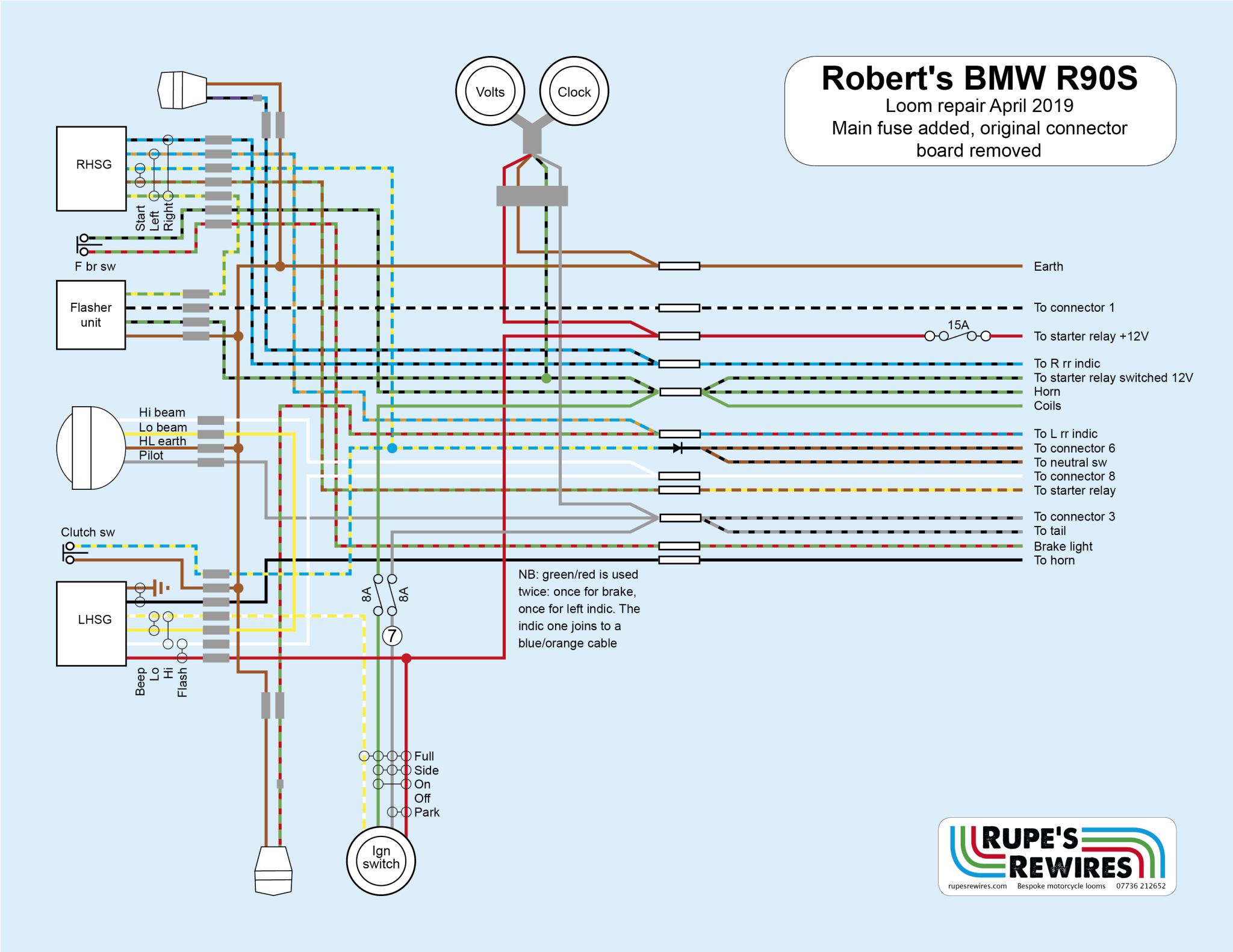 The original BMW wiring diagram is hand drawn and, to say the least, confusing. I redrew the front bit in colour, then tested it against the remains of the loom on the bike. Eventually this process produced a new diagram, which showed how to build the new loom. Then it was just a case of building it.
