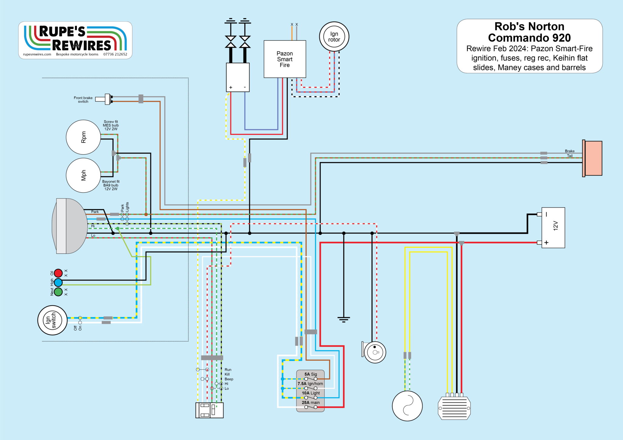 The electrical brief was simple: Pazon Smart-Fire ignition, lights, and a regulator rectifier. Being a fussy sort I added a four-way fuse box as well. (“It’s for your own good you know.”) Building such a simple loom was super quick. As ever, the more time-consuming bit was figuring out the best places to put everything, and making up the necessary bracketry to hang it all on. This is not a standard procedure. I must have done eight or ten Commandos, but every one ended up different.