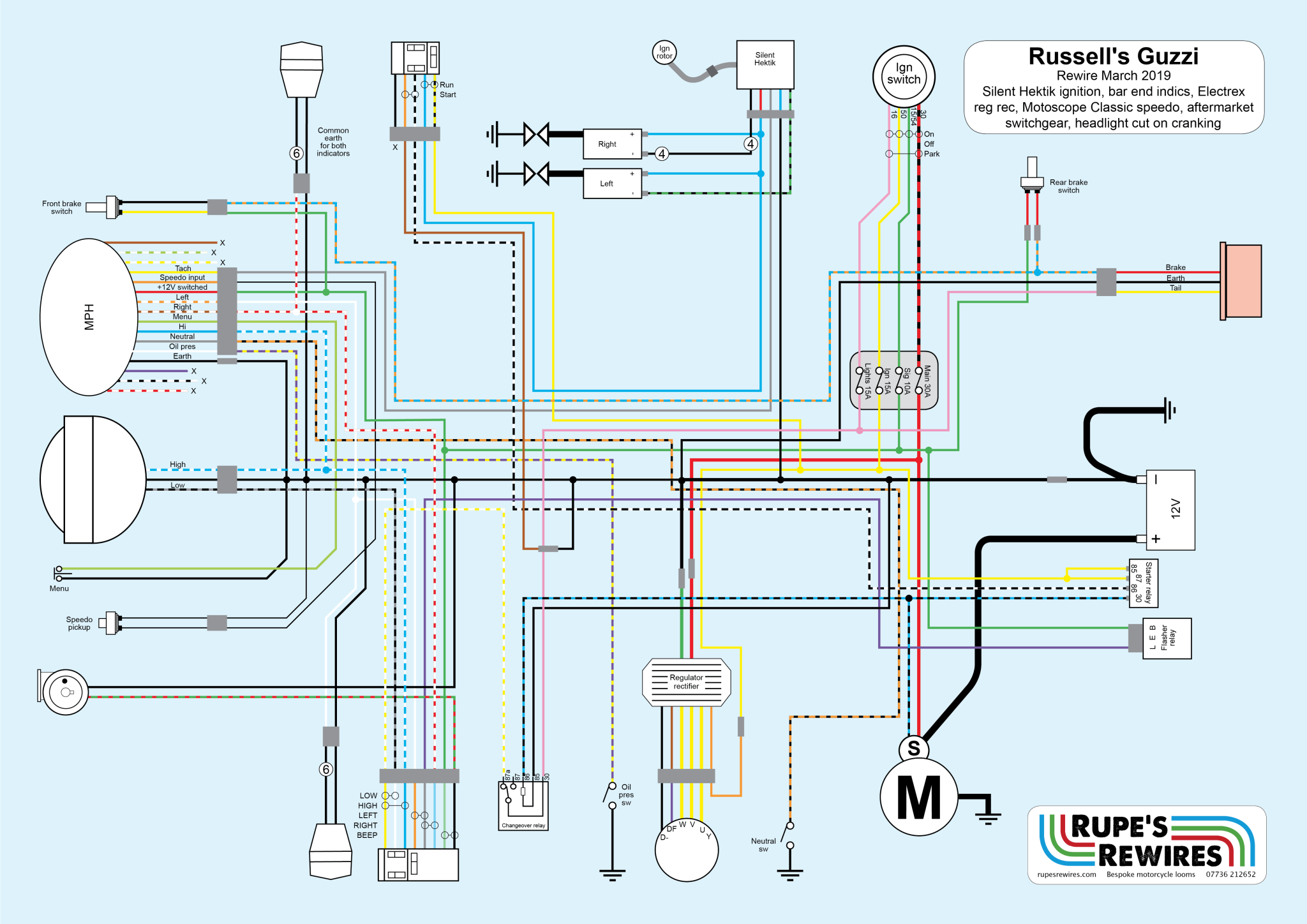 Russell must have liked the loom on his last Guzzi because he brought another cafe racer along. It was built to order by a specialist shop, but the wiring was very poor. The brief was to make it work and keep it discreet.