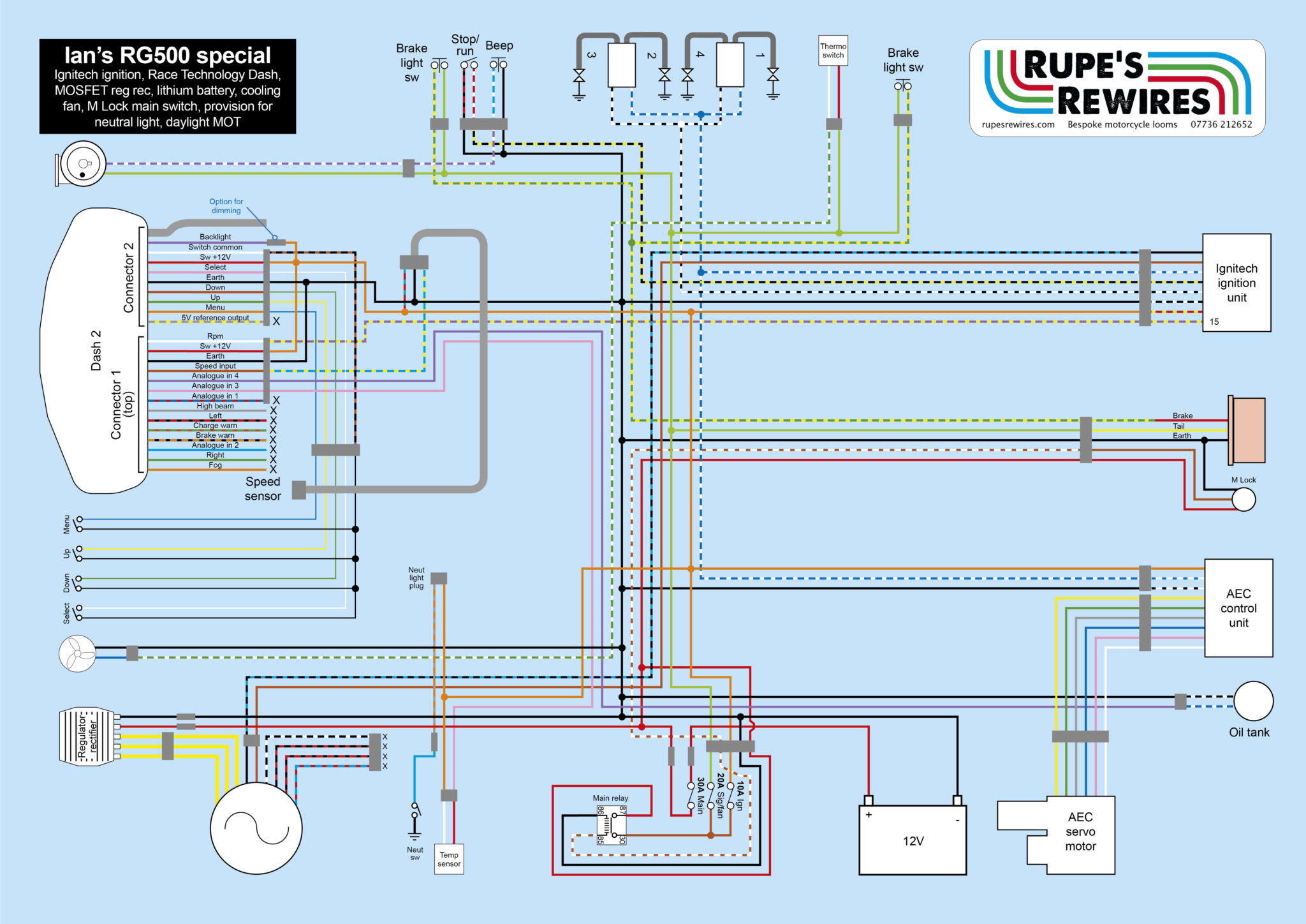 Although owner Ian only wanted a daylight MOT, the wiring was quite a big deal – due mainly to the Race Technology dash which is a racing car system. Cars can afford to have wires sprawling everywhere, but bikes can’t. One way to reduce the clutter was to replace the four separate buttons that control the dash with a single handlebar switch cluster. The obvious place to get that was Bike Sport Developments who can make any kind of push-button switch, in several colours, and engraved if you like. Ian went for all black. Annoyingly, the dash can’t display a neutral light. Instead it works out the gears (from road speed and rpm), and displays a zero when the engine is running and the bike isn’t moving.