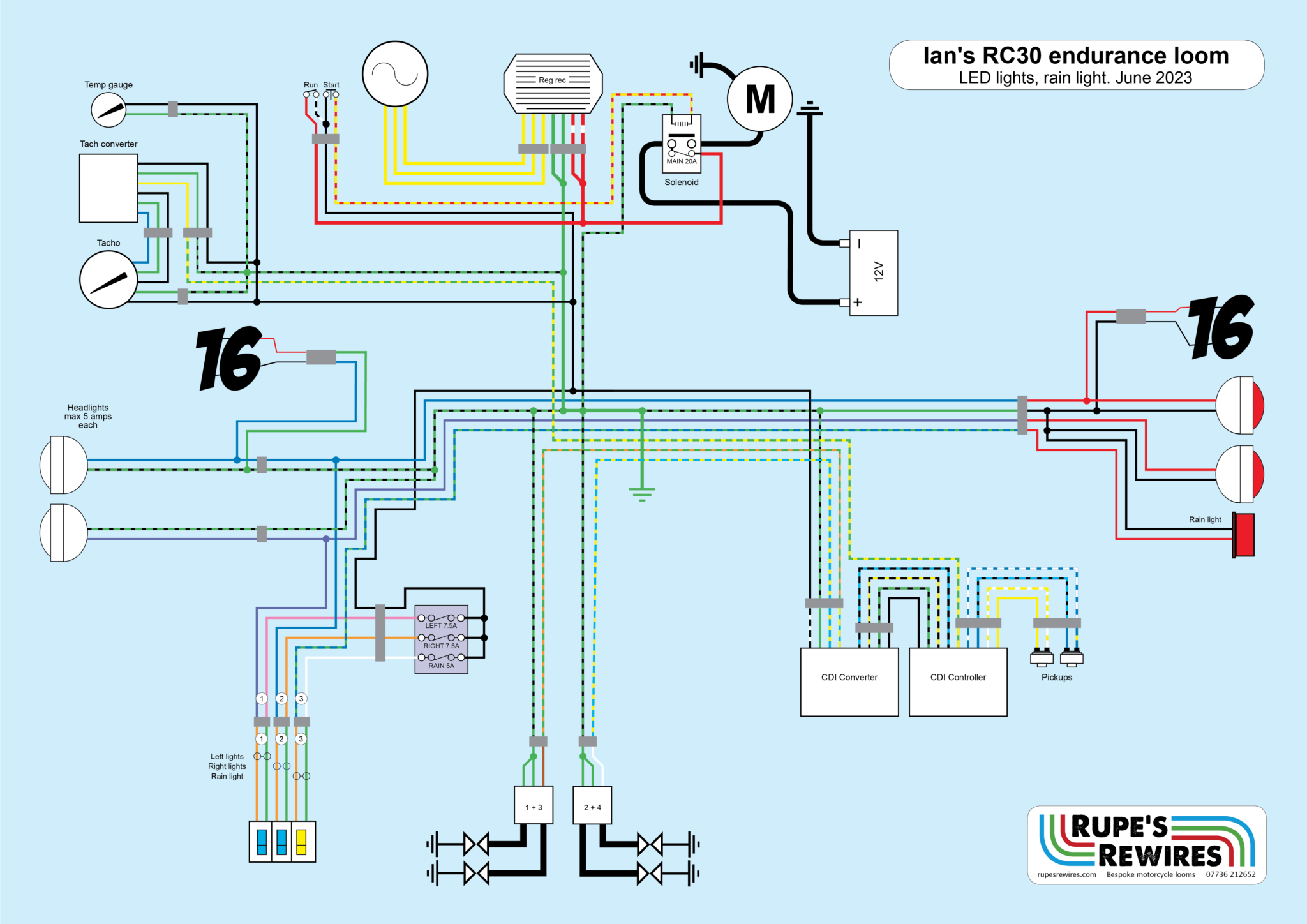 The lights have to be on three independent fused circuits – front and rear left, front and rear right, and rain. On top of that, Ian runs photoluminescent numbers on the bodywork, and uses modern switchgear. And of course, these days the bikes run LED lights, which use less electrical current, so we can do away with the relays that worked the original bulbs.