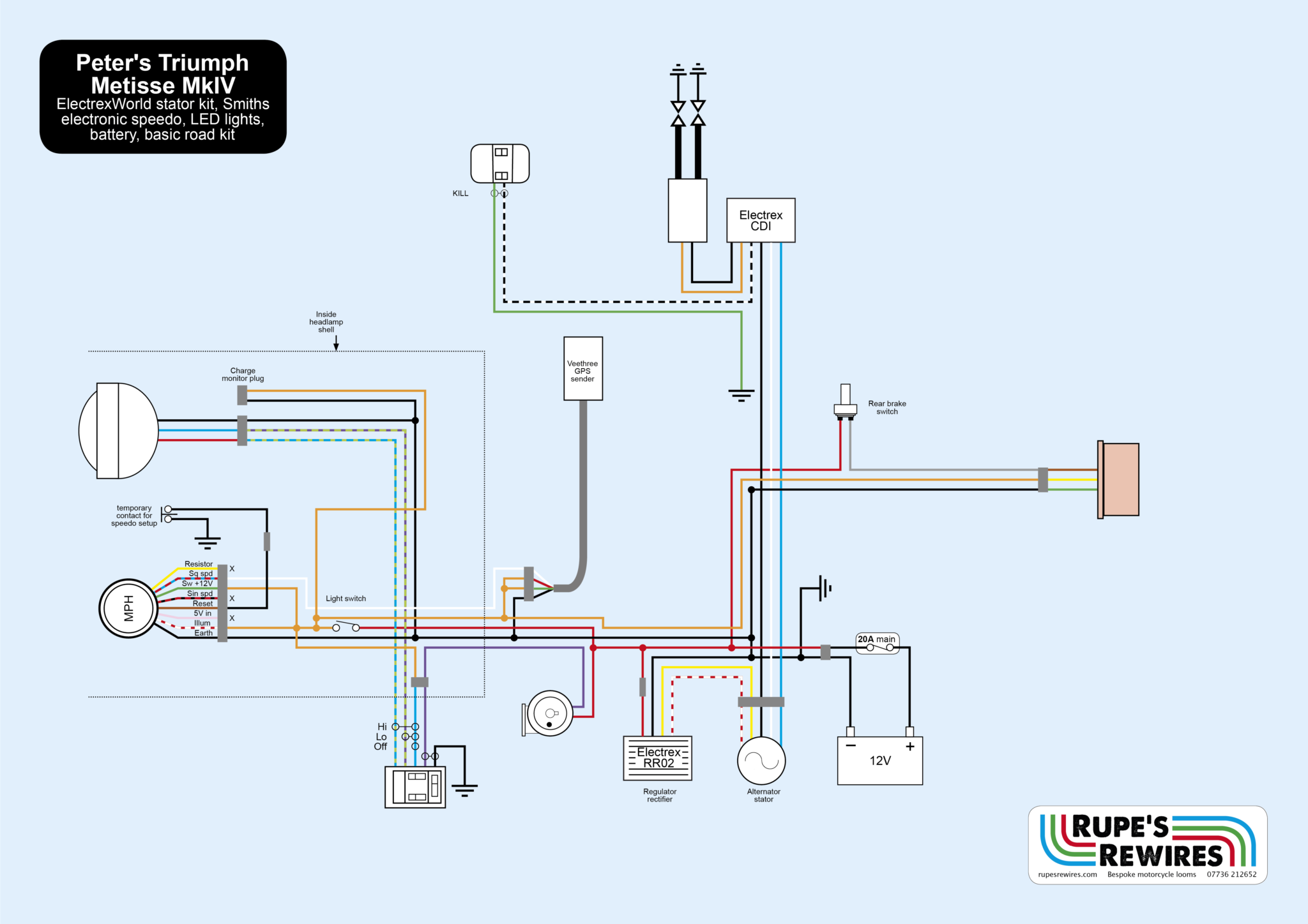 The smallest motorcycle battery you can get that isn’t a lithium is Motobatt’s MBT4BB. At 2.5Ah it should have enough oomph to power Peter’s LED lights. But the ElectrexWorld ignition and charging system is pretty minimal, so to be sure we decided on a charge indicator light. Electrex designed this particular system to run the head and tail light on AC, directly off a charging coil, but you can’t do that with LEDs. Also, running the lights that way results in a truly feeble glow. I should know; I have the same system on my Enfield Meteor.